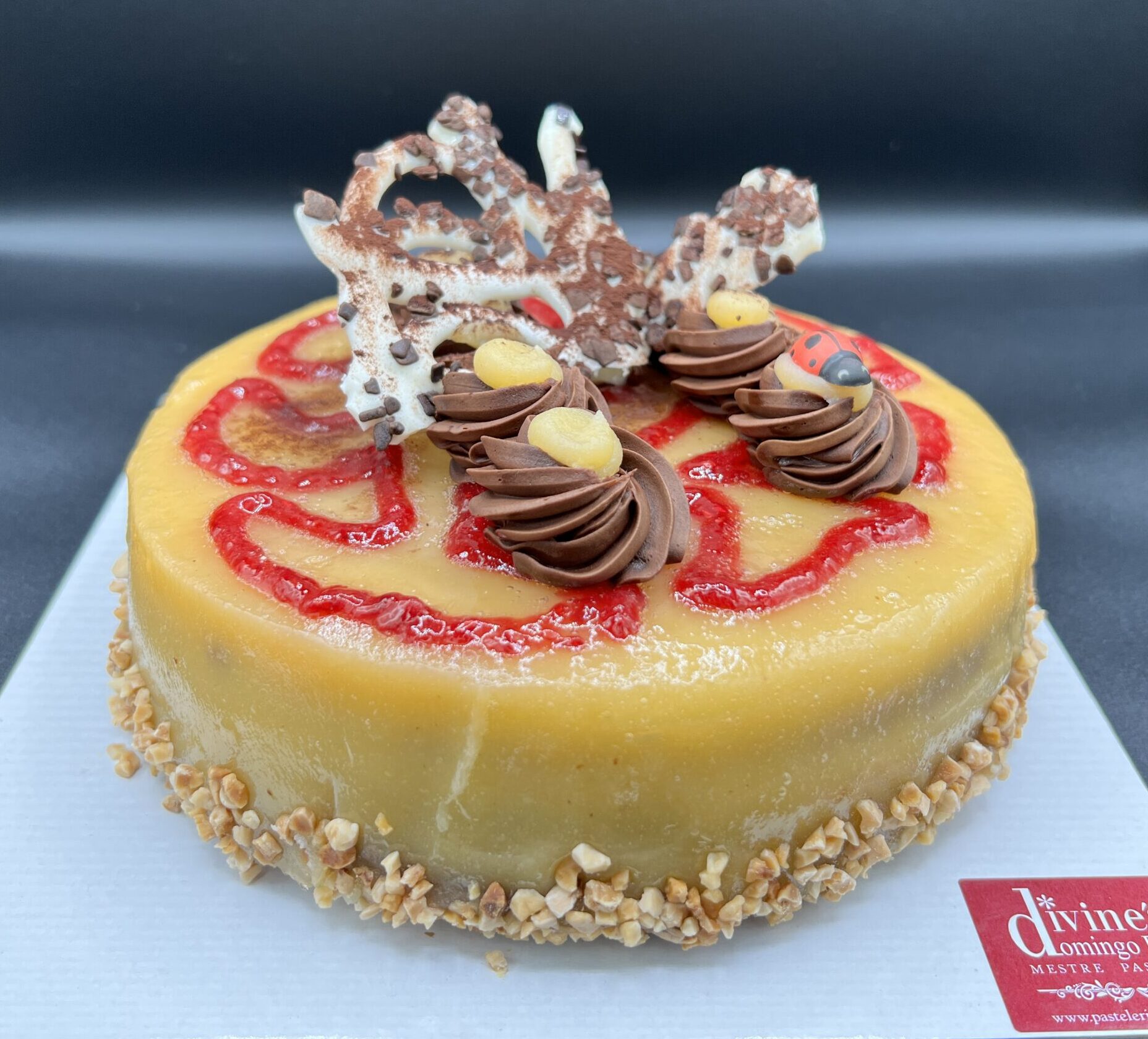 - INGREDIENTES Y ELABORACIÓN: Bizcocho sacher de chocolate, bien bañado, con un relleno de trufa negra, un relleno de yema de limón, , alisado con más yema de limón y decorado con un zigzag de mermelada de frambuesa, engranillado con almendra y acabado con decoraciones de chocolate.